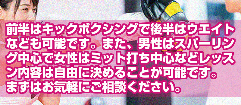 総合格闘技をやる上で重要な打撃・投げ・寝技・レスリング・パウンドなどのレッスンをします。